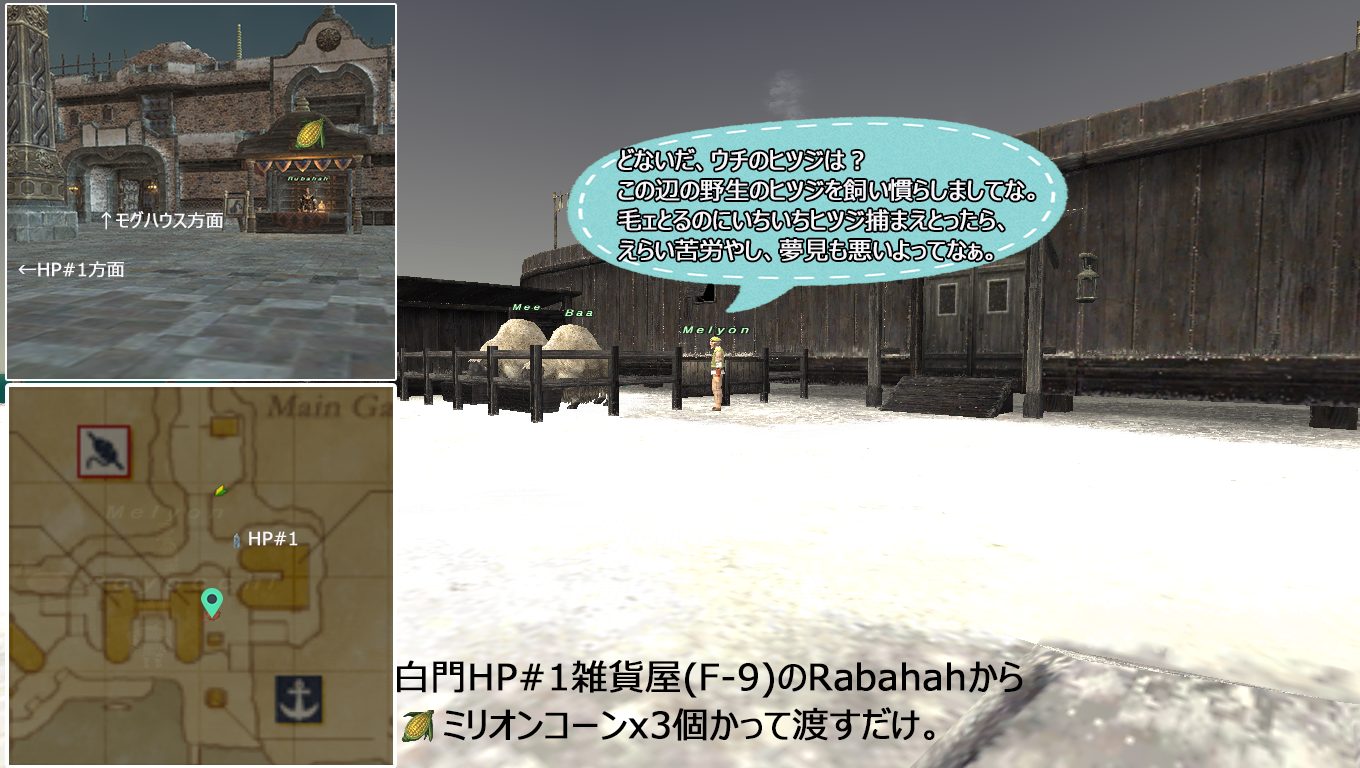 - セルビナHP#1織工ギルド売店前(I-9)にいるMelyonに話しかける。
