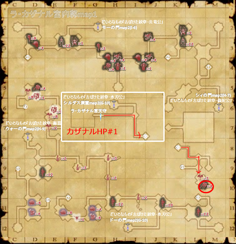 ラ・カザナル宮内閣 | ![]() カザナルHP#1から、(K-9)でmap1へ→(L-10)の広場に4匹 |