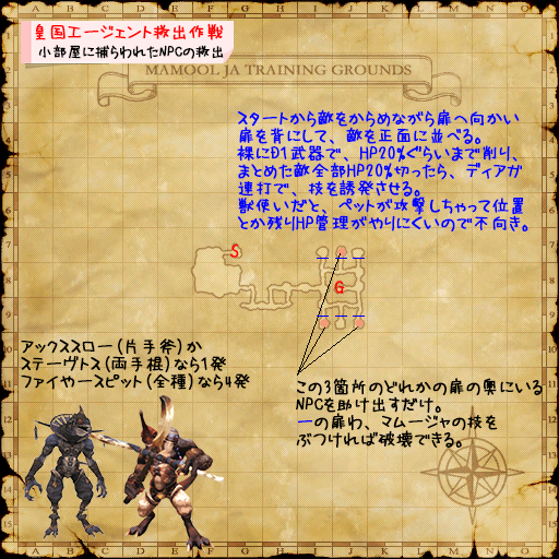 獣使いが一人でもいるとクリアがかなり楽になる。広域スキャンで各敵の所在がつかめる上、 リーチ、トカゲ、クモ、ラプトル(多少難あり)が操れる為、リンクしてもかえれで処理ができる。 しかも、これらの操れる4種は範囲WSである為、WS打たせるまでペットにタゲとらせて見てるだけでよいので一人別行動だとペースも早い。
