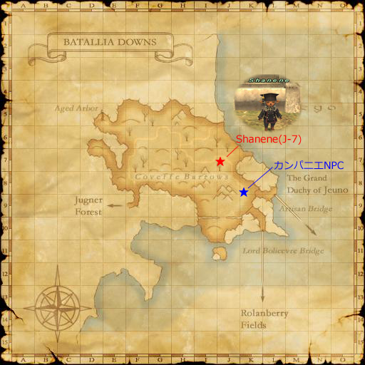 だいじなもの「未完成のスクロールの束」を入手。 - バタリア丘陵〔S〕(J-7)の"Shanene"に話しかけ、スクロール「盟-ライニマード ●●」を入手。