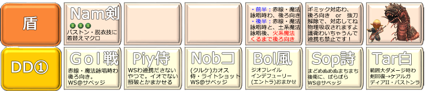 - 左のかがり火前に、DDさん。右のかがり火前に、盾・後衛さん。