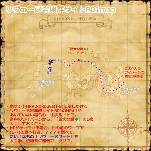 - リヴェーヌ岩塊群サイトA01・B01どちらかの帝龍の飛泉に入る直前の島の???(E-7)を調べて