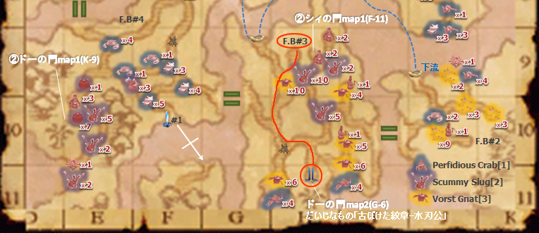 もしくわ、モリマー台地HP#1から○の段差おりて○の???(H-5)へ(要インスニ) - ???を調べて、モーの門Map2へワープ。そこから現地へ(要スニ) ○の雑魚2匹で、トリガー狙い。